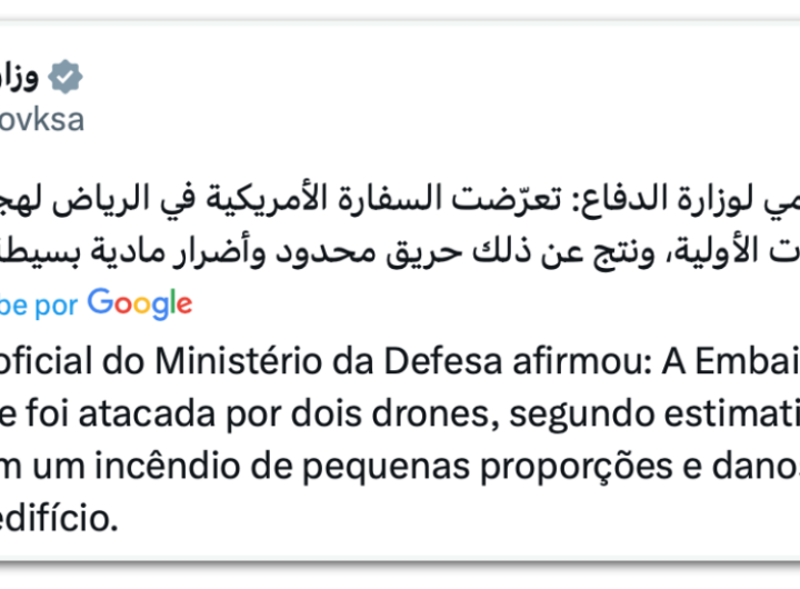 Embaixada dos EUA na Arábia Saudita é atingida por drones 3 min read Geral Embaixada dos EUA na Arábia Saudita é atingida por drones RealRadioTvBrasil março 3, 2026