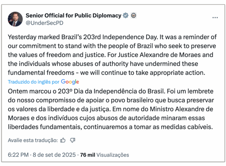 O deputado federal Eduardo Bolsonaro (PL-SP) disse nesta 2ª feira (8.set.2025) que estender a bandeira gigante dos Estados Unidos na avenida...