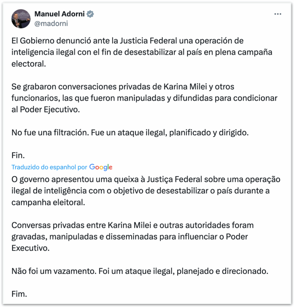 A Justiça da Argentina autorizou nesta 2ª feira (1º.set.2025) a proibição da circulação de áudios atribuídos a Karina Milei, secretária-geral da...