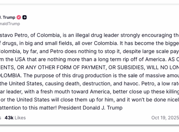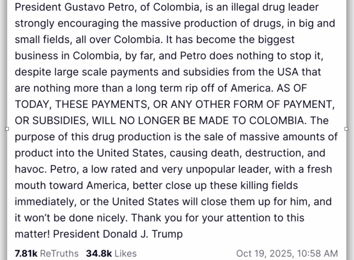 Trump acusa presidente da Colômbia de ser “traficante de drogas” 2 min read Geral Trump acusa presidente da Colômbia de ser “traficante de drogas” RealRadioTvBrasil outubro 19, 2025