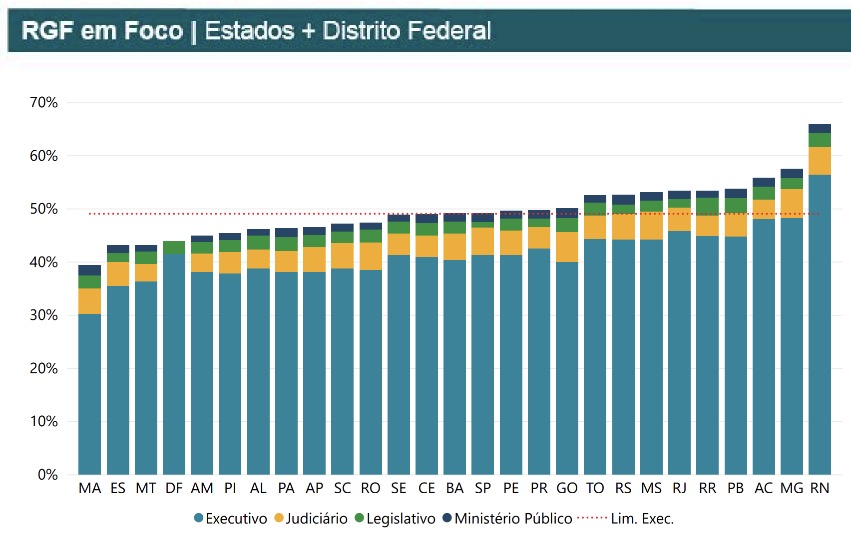 O Rio Grande do Norte teve comprometimento de 56,4% de sua receita corrente líquida ajustada com despesa de pessoal. O Estado ultrapassou o limite previsto para o tipo de gasto na Lei de Responsabilidade Fiscal para o Poder Executivo (49%).