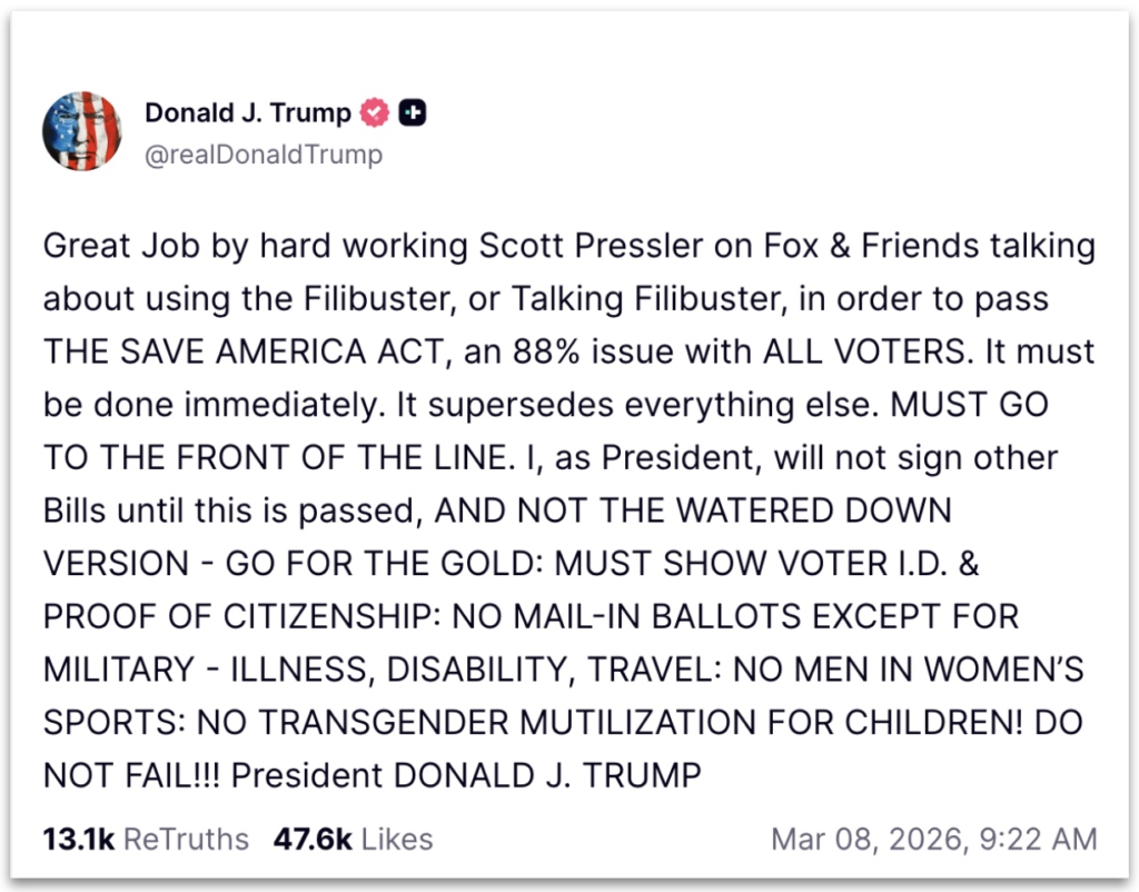 Donald Trump (Partido Republicano), presidente dos Estados Unidos, afirmou no domingo (8.mar.2026) que não assinará nenhum projeto de lei até que o Congresso aprove o Save America Act: projeto estabelece 2 requisitos para o processo eleitoral: