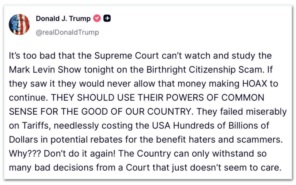 Na publicação feita na Truth Social, Trump faz referência ao programa “Life, Liberty and Levin”, no qual o apresentador argumentou contra a cidadania por nascimento.
