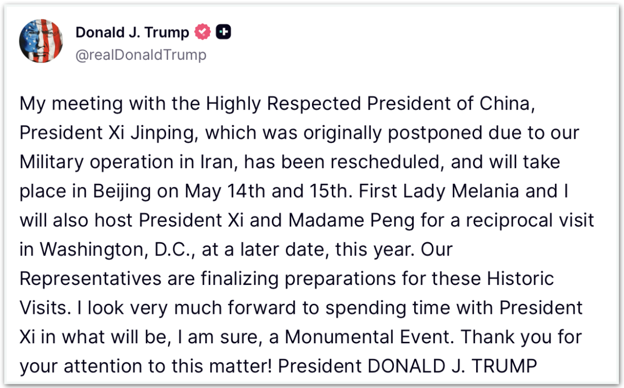 Trump divulgou a remarcação da reunião bilateral por meio da rede Truth Social, sua plataforma de mídia social. O presidente informou que as equipes dos 2 países estão finalizando os preparativos para o encontro na capital chinesa.