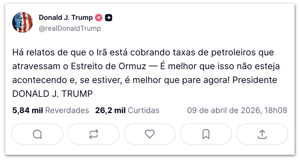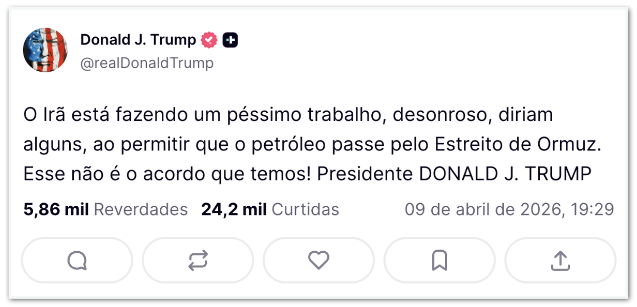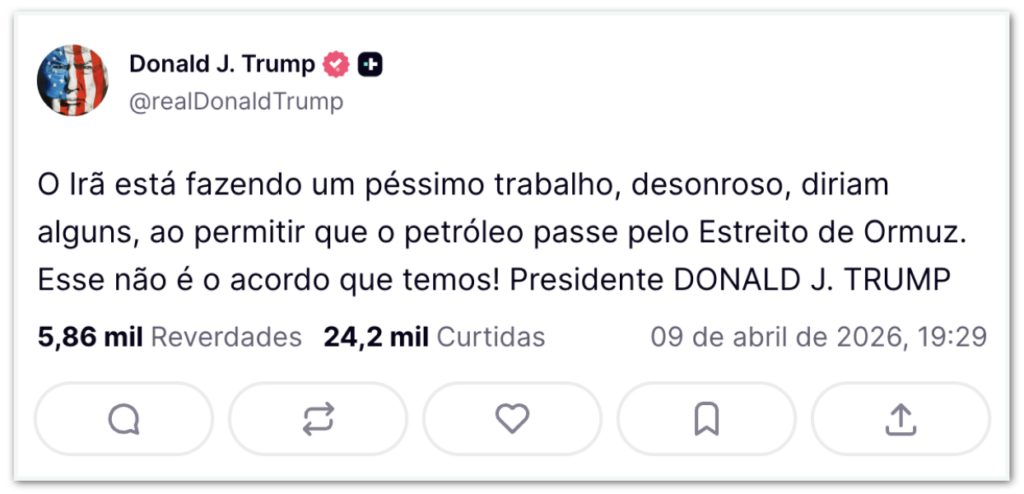Na 5ª feira (9.abr.2026), o presidente dos Estados Unidos, Donald Trump (Partido Republicano), afirmou em seu perfil no Truth Social que o Irã estaria fazendo “um péssimo trabalho, desonroso, diriam alguns” no estreito de Ormuz. A publicação integra uma série de postagens sobre o conflito feitas no mesmo dia.