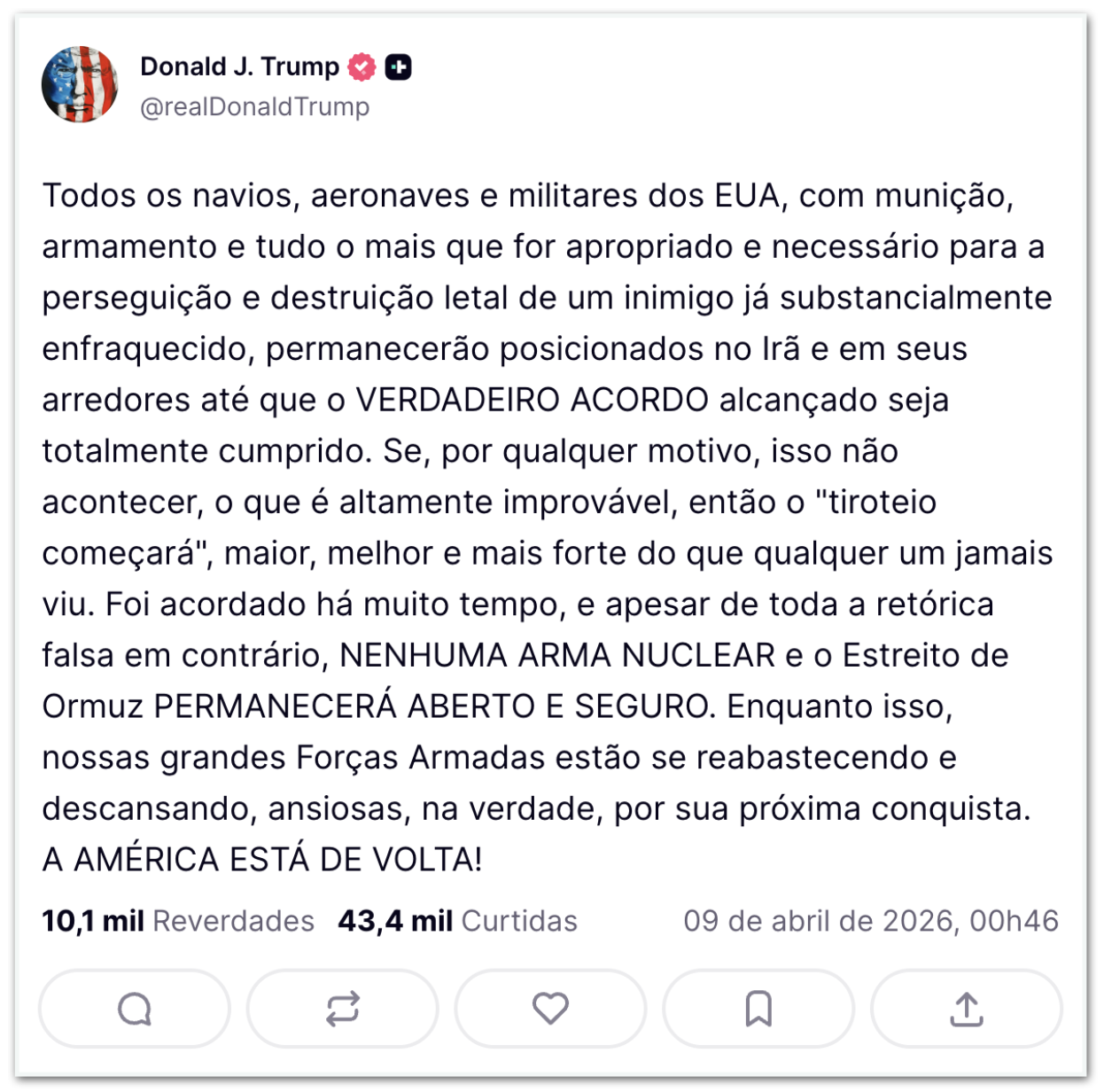 Em outra publicação, Trump afirmou que forças militares dos Estados Unidos permanecerão “posicionadas no Irã e em seus arredores” até que o que chamou de “verdadeiro acordo” seja integralmente cumprido. Ele também indicou possibilidade de escalada militar caso os termos não sejam respeitados.