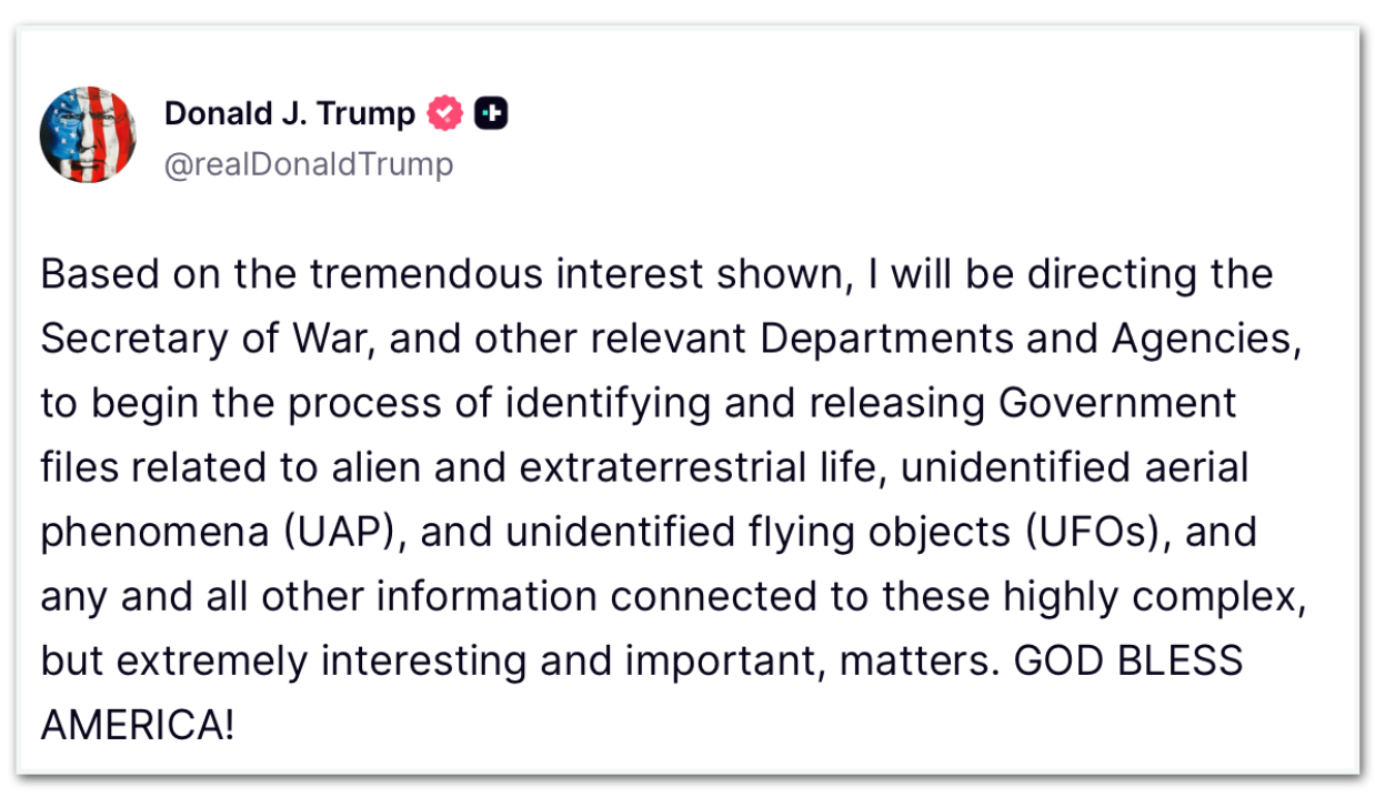Em declaração na rede social Truth Social, Trump disse: “Com base no enorme interesse demonstrado, vou instruir o Secretário da Guerra e outros departamentos e agências relevantes a iniciar o processo de identificação e divulgação de arquivos do governo relacionados a alienígenas e vida extraterrestre, UAPs (fenômenos aéreos não identificados) e UFOs (objetos voadores não identificados), e toda e qualquer outra informação conectada a esses temas altamente complexos, mas extremamente interessantes e importantes”.