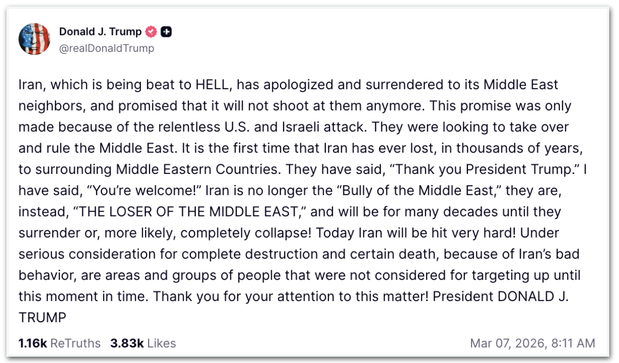 “O Irã, que está sendo duramente atacado, pediu desculpas e se rendeu aos seus vizinhos do Oriente Médio, prometendo que não atirará mais neles. Essa promessa só foi feita por causa dos implacáveis ataques dos EUA e de Israel. Eles buscavam dominar e governar o Oriente Médio. É a 1ª vez em milhares de anos que o Irã perde para os países vizinhos do Oriente Médio”, escreveu Trump em uma publicação na plataforma Truth Social.