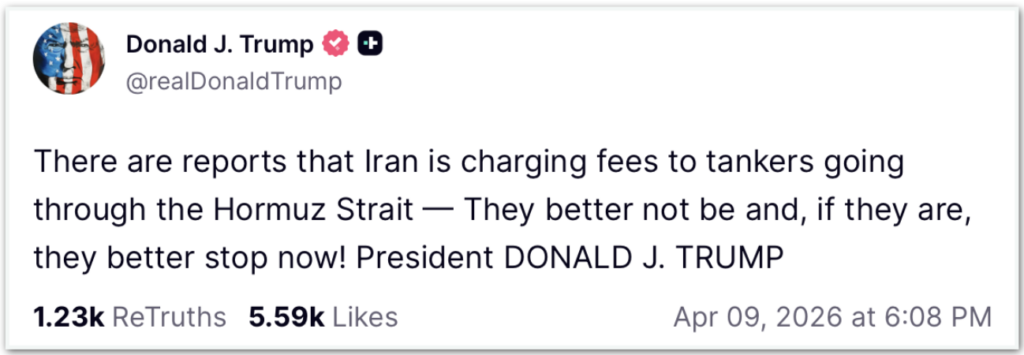 O presidente dos Estados Unidos, Donald Trump (Partido Republicano), afirmou nesta 5ª feira (9.abr.2026) que o Irã não deve cobrar taxas de navegação pelo estreito de Ormuz. Segundo o mandatário, se este for o caso, Teerã deve paralisar imediatamente a prática.