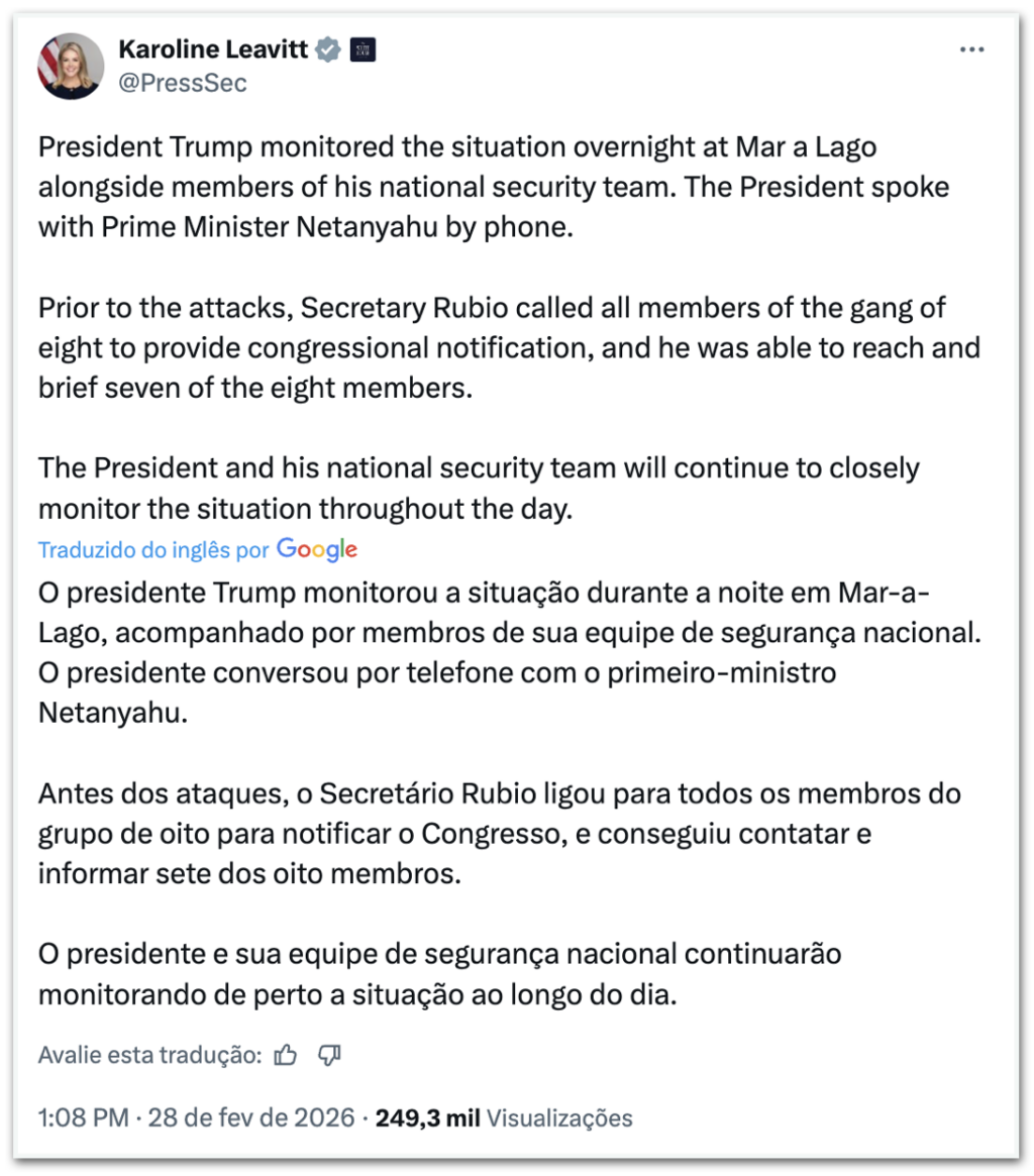 A secretária de imprensa da Casa Branca, Karoline Leavitt, disse neste sábado (28.fev.2026) que o presidente dos Estados Unidos, Donald Trump (Partido Republicano), segue monitorando a situação no Irã depois dos ataques e escalada dos conflitos no Oriente Médio. O texto foi republicado pela conta oficial da Casa Branca no X.