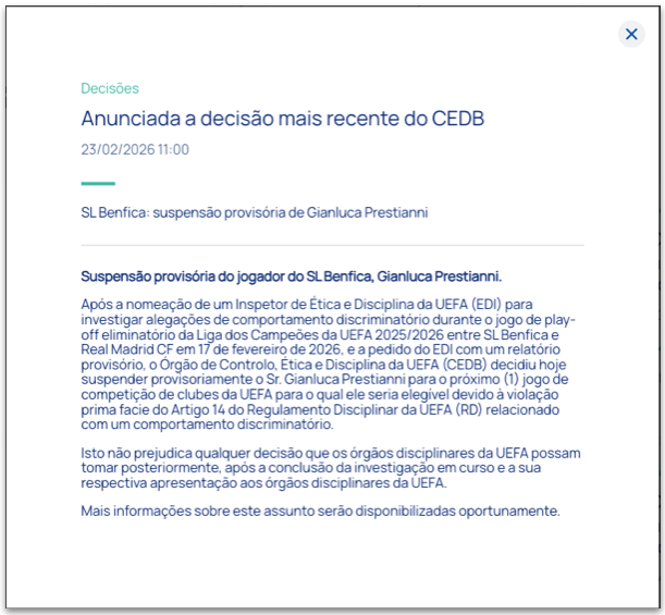 “O Sport Lisboa e Benfica tomou conhecimento da decisão da UEFA de aplicar uma suspensão provisória de um jogo ao seu jogador Gianluca Prestianni, no âmbito da averiguação em curso relativamente ao incidente ocorrido no jogo frente ao Real Madrid. O Clube lamenta ficar privado do jogador enquanto o processo está ainda em investigação e irá apelar desta decisão da UEFA, mesmo se dificilmente os prazos em causa terão qualquer efeito prático para o jogo da segunda mão do play-off da Liga dos Campeões”, declarou o clube em nota oficial.