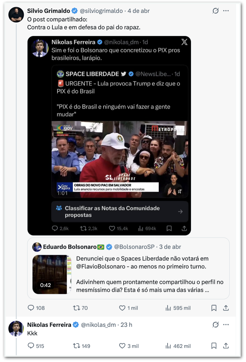 - 2.abr.2026 (14h33) – Nikolas compartilha um post do perfil @NewsLiberdade, critica o presidente Luiz Inácio Lula da Silva (PT) e afirma que foi o ex-presidente Jair Bolsonaro (PL) quem criou o Pix;