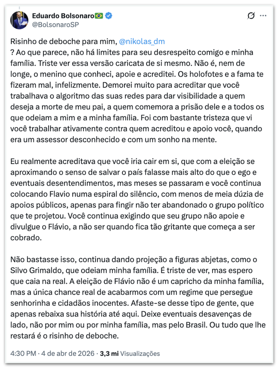 - 4.abr.2026 (16h30) – Eduardo chama a mensagem de Nikolas de “risinho de deboche” e afirma que o deputado mineiro o desrespeitou.