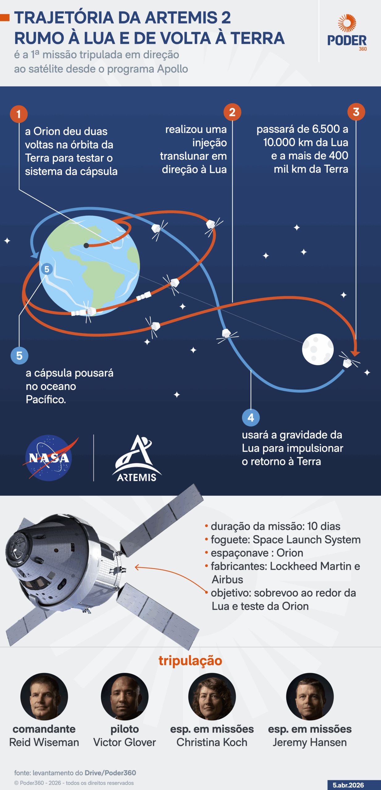 A cápsula Orion enviada à missão Artemis 2 com 4 astronautas pousou às 21h07 desta 6ª feira (10.abr.2026) no Oceano Pacífico, próximo à costa da Califórnia, nos Estados Unidos. A viagem espacial da Nasa durou 10 dias e marcou o retorno dos seres humanos às proximidades da Lua depois de mais de 50 anos.