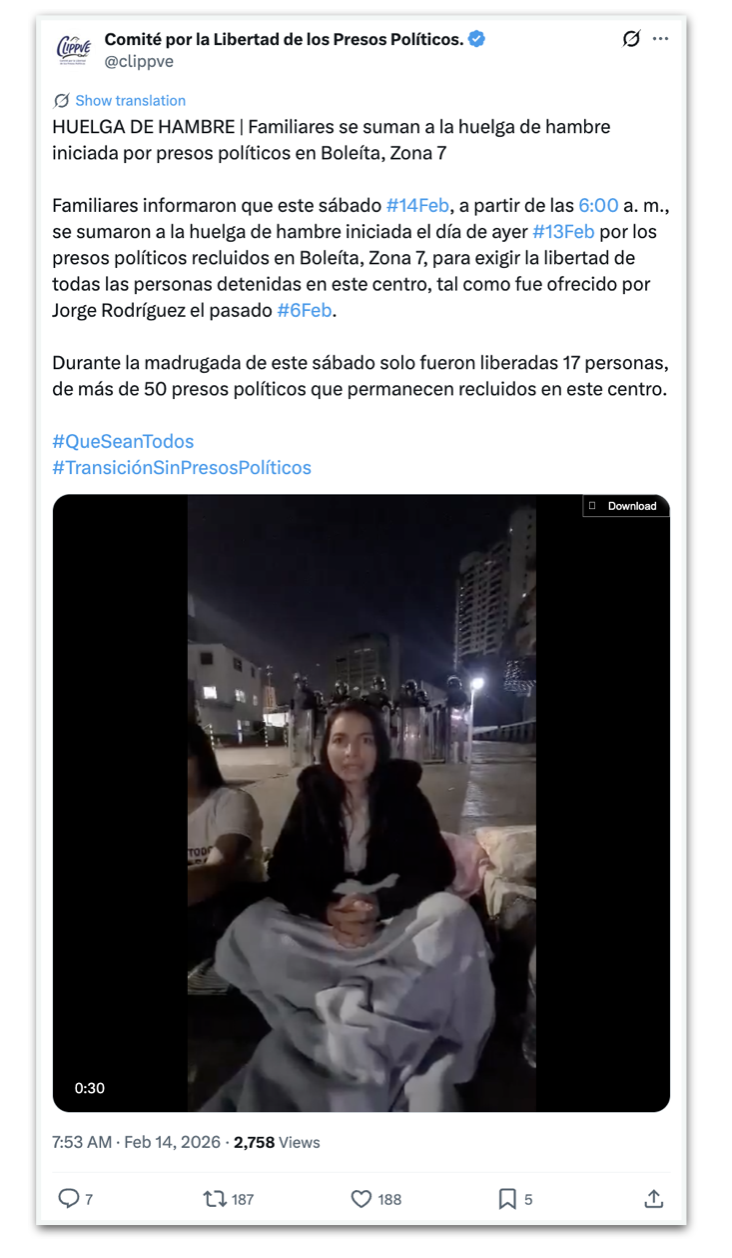 Familiares informaram que, neste sábado, 14.fev, a partir das 6h, aderiram à greve de fome iniciada ontem, 13.fev, pelos presos políticos detidos em Boleíta, Zona 7, para exigir a libertação de todas as pessoas mantidas nessa unidade, conforme prometido por Jorge Rodríguez em 6.fev.