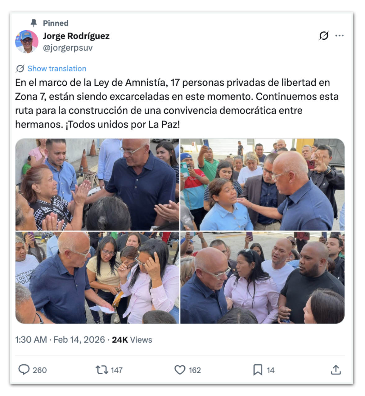 O presidente da Assembleia Nacional, Jorge Rodríguez (PSUV, esquerda), afirmou que ao menos 17 presos políticos foram libertados neste sábado (14.fev.2026) no centro de detenção da Polícia Nacional Bolivariana conhecido como Zona 7, na região metropolitana de Caracas, capital do país.