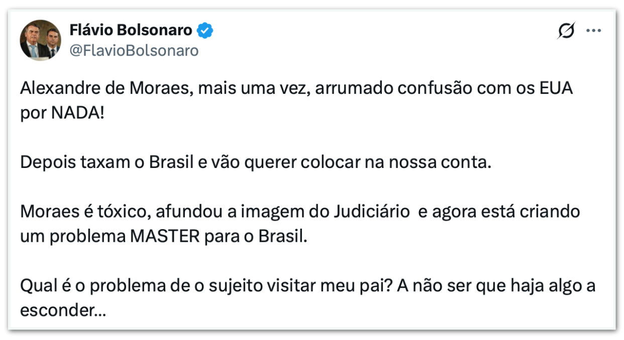 “Alexandre de Moraes, mais uma vez, arrumando confusão com os EUA por nada! Depois taxam o Brasil e vão querer colocar na nossa conta”, escreveu Flávio em uma publicação no X. “Moraes é tóxico, afundou a imagem do Judiciário e agora está criando um problema MASTER para o Brasil. Qual é o problema de o sujeito visitar meu pai? A não ser que haja algo a esconder”, declarou o senador do PL.