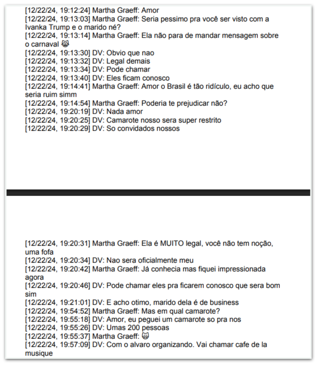 Na troca de mensagens, Martha questiona se a presença da filha do presidente norte-americano, então recém-eleito, poderia causar problemas ao banqueiro. “Seria péssimo pra você ser visto com a Ivanka Trump e o marido né? Ela não para de mandar mensagem sobre o carnaval”, escreveu.