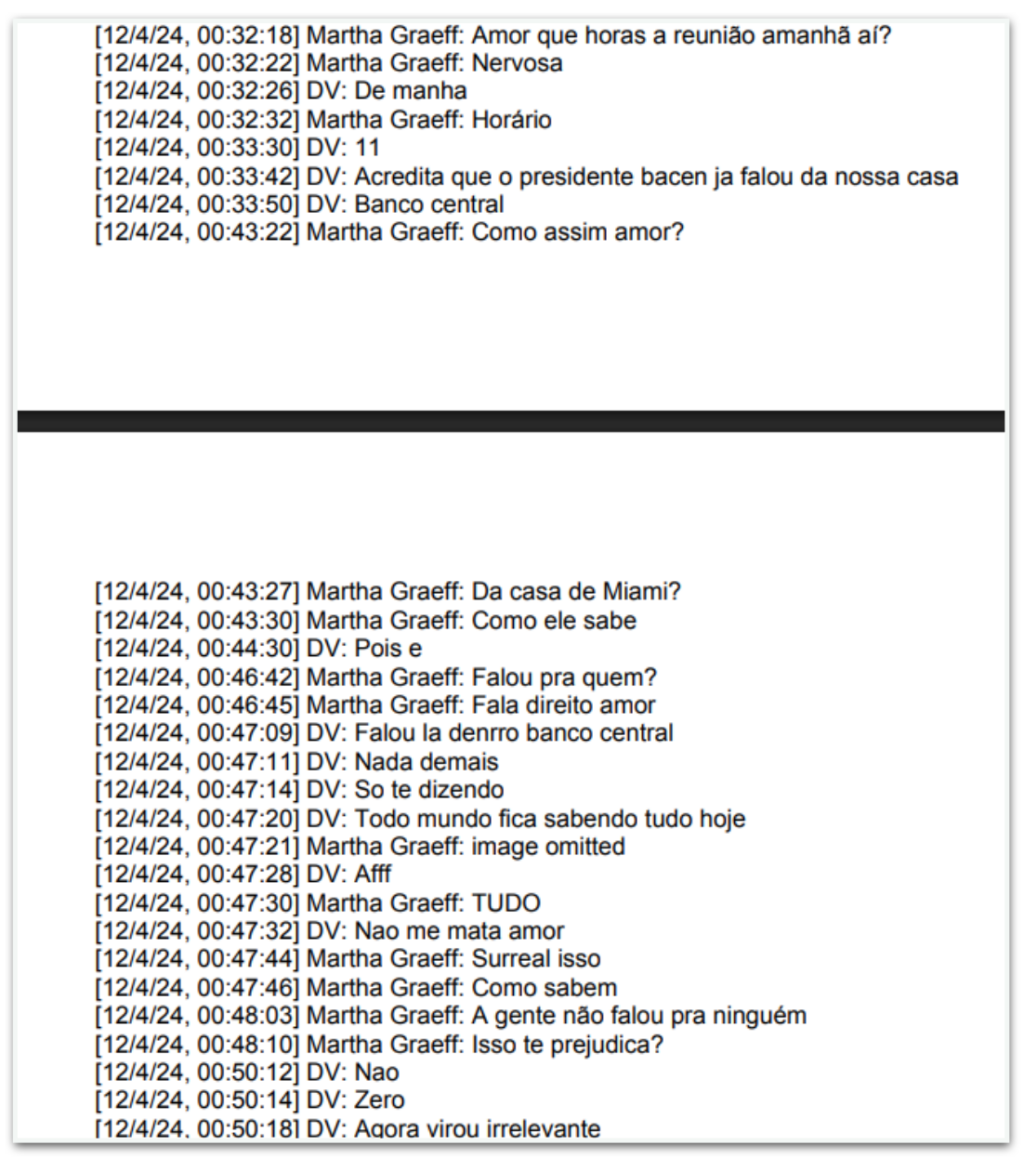 Na madrugada anterior ao encontro, outra sequência mostra Vorcaro comentando que o presidente do BC (Banco Central) já teria citado um imóvel do casal em Miami. Martha pergunta sobre a hora da reunião e diz estar nervosa. Vorcaro responde “De manhã” e, depois, “11”.