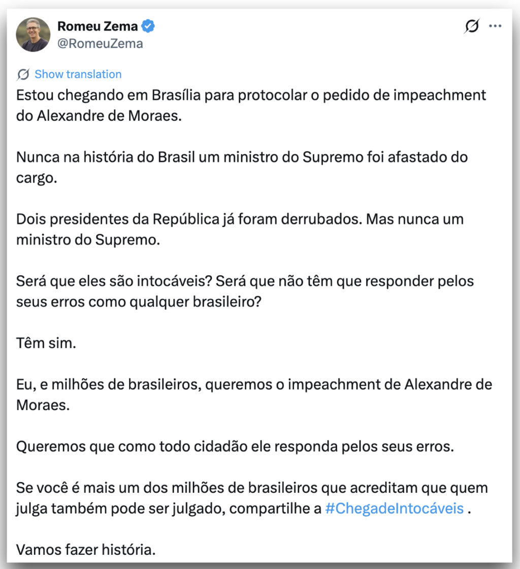 Em publicação no X nesta 2ª feira (9.mar.2026), Zema afirmou que viajou à capital federal para apresentar o pedido. “Estou chegando em Brasília para protocolar o pedido de impeachment do Alexandre de Moraes”, escreveu.
